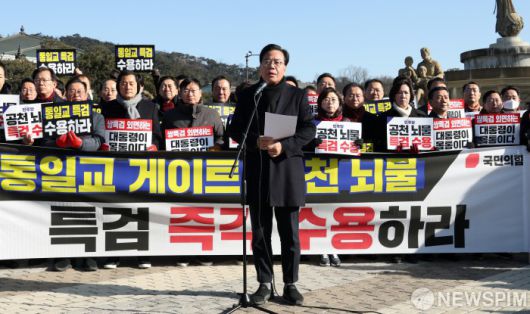 [서울=뉴스핌] 정일구 기자 = 송언석 국민의힘 원내대표가 20일 오전 서울 종로구 청와대 분수대 앞에서 열린 통일교 게이트·더불어민주당 공천뇌물 특검 촉구 규탄대회에서 규탄 발언을 하고 있다. 2026.01.20 mironj19@newspim.com