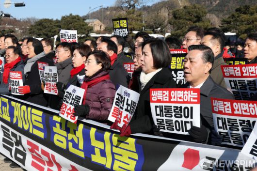 [서울=뉴스핌] 정일구 기자 = 국민의힘 의원들이 20일 오전 서울 종로구 청와대 분수대 앞에서 열린 통일교 게이트·더불어민주당 공천뇌물 특검 촉구 규탄대회에서 구호를 외치고 있다. 2026.01.20 mironj19@newspim.com