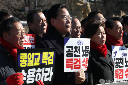 [서울=뉴스핌] 정일구 기자 = 송언석 국민의힘 원내대표와 당 소속 의원들이 20일 오전 서울 종로구 청와대 분수대 앞에서 열린 통일교 게이트·더불어민주당 공천뇌물 특검 촉구 규탄대회에서 손피켓을 들고 있다. 2026.01.20 mironj19@newspim.com
