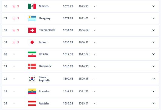 멕시코는 한 계단 하락한 16위, 남아프리카공화국은 한 계단 상승한 60위를 기록했다. 유럽 플레이오프 패스 D에는 덴마크(21위), 체코(43위), 아일랜드(59위), 북마케도니아(66위)가 포함돼 있다.