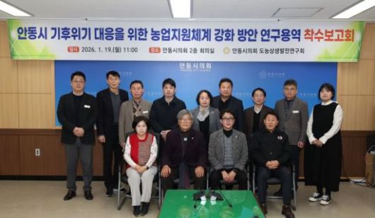안동시의회 의원 연구단체 도농 상생발전 연구회(회장 김창현 의원)는 19일 의회 2층 회의실에서 '안동시 기후 위기 대응을 위한 농업지원체계 강화 방안 연구용역' 착수보고회를 개최했다고 밝혔다.