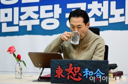 아시아투데이 이병화 기자 = '통일교 게이트 특검·민주당 공천뇌물 특검' 수용을 촉구하며 6일째 단식을 이어가고 있는 장동혁 국민의힘 대표가 20일 국회 로텐더홀 농성장에서 물을 마시고 있다.