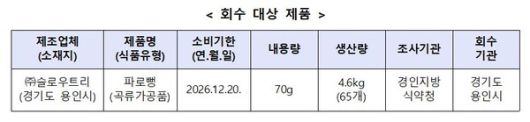 회수 대상은 소비기한이 '2026. 12. 20.'로 표시된 '파로뻥'이다. 식약처는 용인시청이 해당 제품을 신속히 회수하도록 조치했으며, 해당 제품을 구매한 소비자에게는 섭취를 즉시 중단하고 구입처에 반품해 줄 것을 당부했다.
