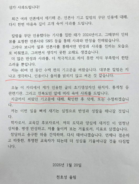 그러면서 "칼럼을 무단 인용했다는 기사를 접한 때가 2024년이고, 그때부터 인터뷰를 요청한 언론사와 SNS 등을 통해 사과와 반성을 전해왔다"고 해명했다.