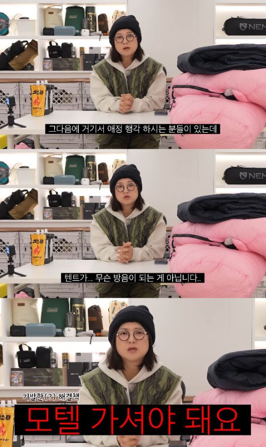 이어 김숙은 캠핑장에서 애정 행각을 하는 이들에게 "텐트가 무슨 방음이 되는 게 아니다. 그냥 천이다. 이 천이 뭘 막겠냐. 거기서 애정 행각을 하시는 분들은 그냥 모텔을 가셔야 된다"고 강하게 일침을 날렸다.