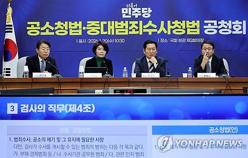 더불어민주당, 중수청·공소청법 공청회(서울=연합뉴스) 이동해 기자 = 20일 서울 여의도 국회에서 공소청법·중대범죄수사청법 공청회가 열리고 있다. 이날 공청회에서는 정부안에 담긴 중수청 인력의 이원화 구조(수사사법관·전문수사관), 수사 범위와 공소청의 3단 구조 등을 놓고 집중적인 논의가 이뤄진다. 2026.1.20 eastsea@yna.co.kr