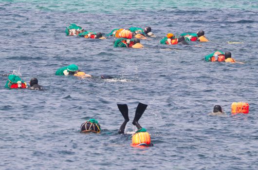 제주시 구좌읍 행원포구 인근에서 해녀들이 해산물 채취를 위해 바다로 나가고 있다./뉴스1 |