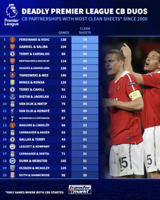 1위는 역시 맨체스터 유나이티드의 황금기를 이끌었던 리오 퍼디난드와 네마냐 비디치였다. 138경기 동안 70회의 클린시트를 기록했다. 이미 맨유에서 활약하고 있었던 퍼디난드는 비디치가 합류한 2005-06시즌부터 합을 맞췄고, 2013-14시즌을 끝으로 두 선수 모두 맨유와 작별했다. 그동안 이룬 업적도 대단했다. 프리미어리그 5회 우승, 유럽축구연맹(UEFA) 챔피언스리그(UCL) 우승 1회, 잉글리시 풋볼리그(EFL)컵 3회 우승 등 수많은 금자탑을 쌓았다.