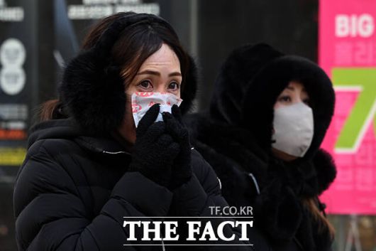 [더팩트ㅣ서예원 기자] 절기상 대한(大寒)인 20일 오전 서울 중구 명동 거리를 지나는 한 외국인이 얼굴에 핫팩을 대고 있다.