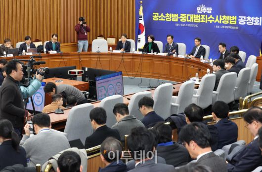 20일 서울 여의도 국회에서 열린 더불어민주당 공소청법, 중대범죄수사청법 공청회에서 민주당 의원들이 발표를 경청하고 있다. 고이란 기자 photoeran@ |