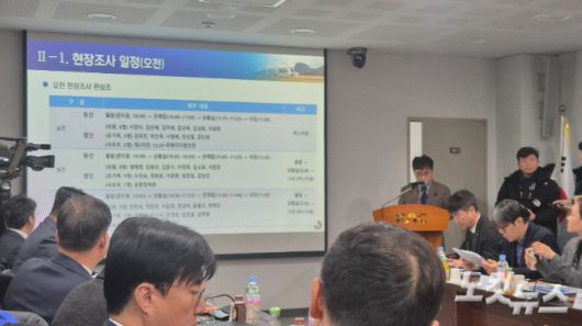 20일 오전 10시 30분쯤 12·29 여객기 참사 진상규명을 위한 국회 국정조사 특별위원회 현장조사 일정을 무안공항장이 설명하고 있다. 한아름 기자 |