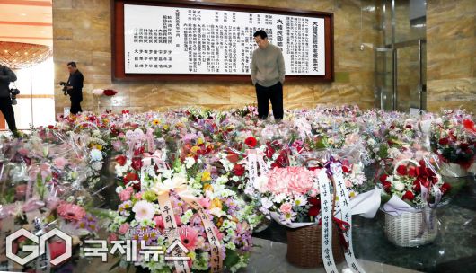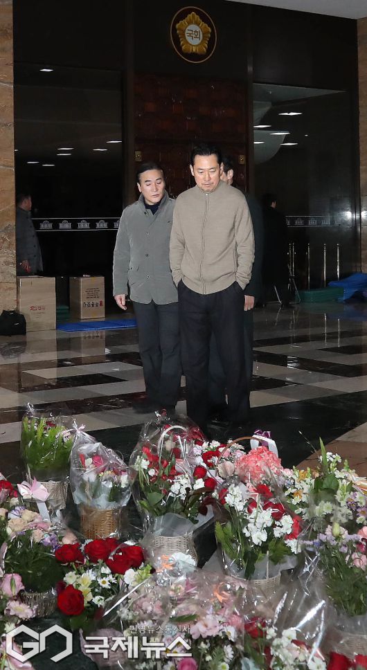 (서울=국제뉴스) 단식 농성 중인 장동혁 국민의힘 대표가 20일 서울 여의도 국회 로텐더홀에 쌓인 꽃바구니를 보고 있다./사진=이용우 기자