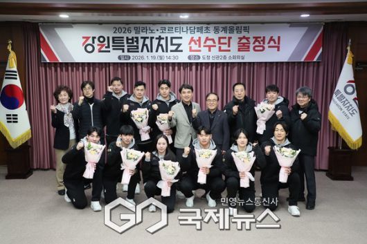 (강원=국제뉴스) 고정화 기자 = 강원특별자치도(도지사 김진태)는 19일 오후 2시 30분, 도청 신관 소회의실에서 '2026 밀라노·코르티나담페초 동계올림픽'에 출전하는 도 선수단의 선전을 기원하는 출정식을 개최했다.