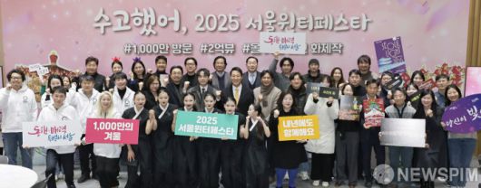 [서울=뉴스핌] 양윤모 기자 = 오세훈 서울시장이 20일 '2025 서울윈터페스타'의 운영 성과를 공유하기 위한 간담회 '수고했어, 2025 서울윈터페스타'에서 참석자들과 기념촬영을 하고 있다. 이날 행사에는 오세훈 서울시장을 비롯해 윈터페스타에 참여한 기관 관계자, 축제 감독, 행사 참여 시민 등 50여명이 참석했다. 2026.01.20 yym58@newspim.com |