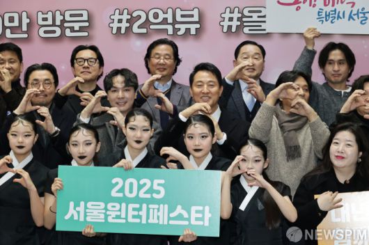[서울=뉴스핌] 양윤모 기자 = 오세훈 서울시장이 20일 '2025 서울윈터페스타'의 운영 성과를 공유하기 위한 간담회 '수고했어, 2025 서울윈터페스타'에서 참석자들과 손으로 S자를 만들고 있다.이날 행사에는 오세훈 서울시장을 비롯해 윈터페스타에 참여한 기관 관계자, 축제 감독, 행사 참여 시민 등 50여명이 참석했다. 2026.01.20 yym58@newspim.com
