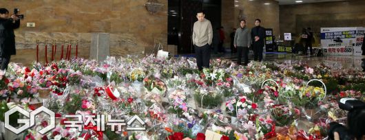 (서울=국제뉴스) 단식 농성 중인 장동혁 국민의힘 대표가 20일 서울 여의도 국회 로텐더홀에 쌓인 꽃바구니를 보고 있다./사진=이용우 기자