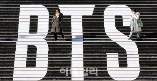 [이데일리 방인권 기자] 그룹 방탄소년단(BTS)이 컴백을 앞두고 3월 20일 광화문 일대에서 공연을 펼치는 방안을 추진하고 있는 가운데 20일 서울 세종문화회관 계단에 설치된 그룹 방탄소년단(BTS) 관련 홍보물 앞을 시민들과 외국인들이 지나고 있다. 소속사 하이브는 최근 국가유산청에 3월 말 광화문, 경복궁 일대에서 방탄소년단이 출연하는 K팝 공연을 개최하기 위해 장소 사용 허가를 신청했다.