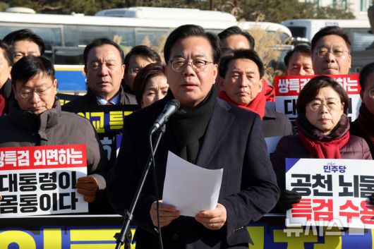송언석 원내대표는 이날 서울 종로구 청와대 사랑채 분수대 앞에서 열린 규탄대회에서 "민주당의 통일교 불법 자금 수수 의혹, 공천 과정에서의 뇌물 수수 의혹, 한 마디로 검은돈을 뿌리 뽑기 위해 쌍특검을 반드시 수용해야 한다"고 말했다.