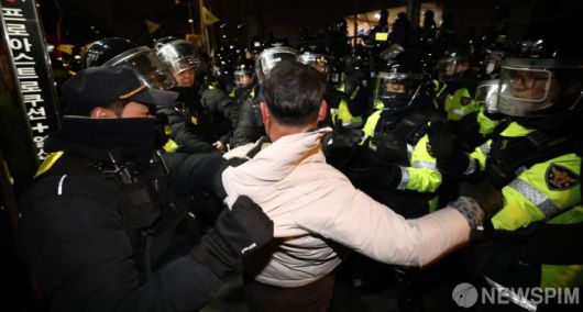 [서울=뉴스핌] 이형석 기자 = 경찰청이 '집회·시위 대응 및 경력 운용 패러다임 전환 TF'를 운영하면서 집회·시위 대응 방향 전환을 시도한다. 사진은 지난해 1월 19일 새벽 서울 마포구 서울서부지방법원 청사 주변에서 경찰이 시위대를 진압하고 있다. 이날 윤석열 대통령 구속영장이 발부되자 윤 대통령 지지자들이 서울서부지법에 난입해 유리창을 깨고 집기를 훼손하는 등 난동을 부려 경찰이 강제진압에 나갔다. leehs@newspim.com |