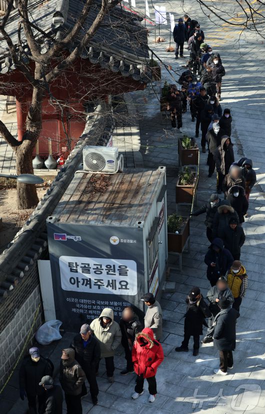 (서울=뉴스1) 김진환 기자 = 절기상 대한(大寒)이자 한파특보가 발효된 20일 서울 종로구 탑골공원 원각사 노인 무료급식소를 찾은 어르신들이 식사를 위해 줄을 서 있다. 2026.1.20/뉴스1