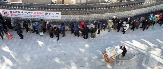 (서울=뉴스1) 김진환 기자 = 절기상 대한(大寒)이자 한파특보가 발효된 20일 서울 종로구 탑골공원 원각사 노인 무료급식소를 찾은 어르신들이 식사를 위해 줄을 서 있다. 2026.1.20/뉴스1