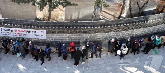 (서울=뉴스1) 김진환 기자 = 절기상 대한(大寒)이자 한파특보가 발효된 20일 서울 종로구 탑골공원 원각사 노인 무료급식소를 찾은 어르신들이 식사를 위해 줄을 서 있다. 2026.1.20/뉴스1