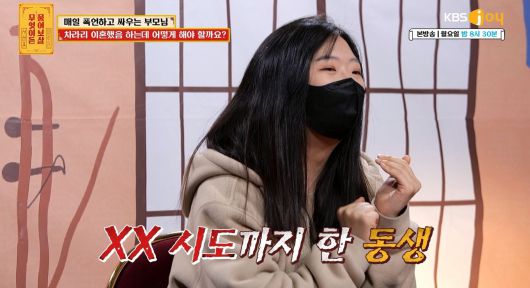 [스타데일리뉴스=서태양기자] KBS Joy '무엇이든 물어보살' 348회에는 26세 사연자가 출연해 부모의 극심한 금전 갈등으로 인한 고통을 털어놓았다. 사연자는 서로 죽일 듯 싸우면서도 이혼하지 않는 부모의 모습을 이해하기 어렵다며 두 분을 사랑하지만 너무 힘들다고 말했다.