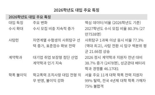 [파이낸셜뉴스] 2026학년도 대학 입시는 수시 모집 확대, 사탐런, 계약학과 인기 등의 특징을 보인 가운데 학교폭력 이력이 모든 전형에 의무 반영돼 수험생의 도덕성까지 당락의 핵심 요소로 부상했다. 이같은 현상은 2027학년도 대입에서도 지속될 것으로 보인다.