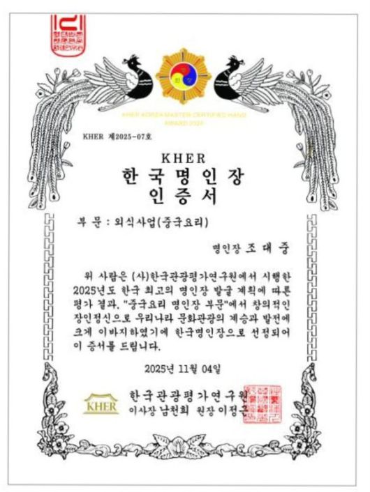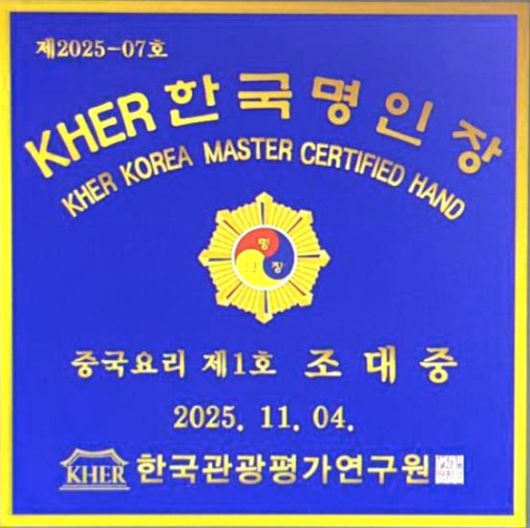 (화성=국제뉴스) 최원만 기자 = 화성시 향남읍에서 중화요리 전문점 '황실'을 운영 중인 조대중 대표가 2025년 11월, 한국관광평가연구원(KHER)이 선정하는 한국명인장(외식산업·중국요리 부문)에 이름을 올렸다.