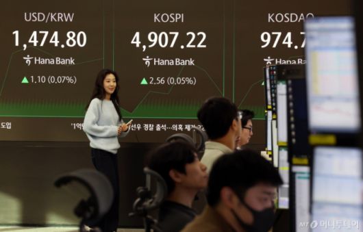 코스피가 전 거래일(4904.66)보다 4.38포인트(0.09%) 하락한 4900.28에 개장한 20일 오전 서울 중구 하나은행 딜링룸 전광판에 지수가 표시되고 있다. 코스닥 지수는 전 거래일(968.36)보다 4.81포인트(0.50%) 오른 973.17에 거래를 시작했다. 원·달러 환율은 전 거래일 주간거래 종가(1473.7원)보다 0.8원 오른 1474.5원에 출발했다. /사진=뉴시스 |