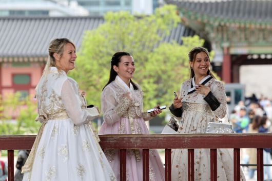 지난해 봄 서울 경복궁을 찾은 이탈리아 관광객들이 웃으며 대화하는 모습. 김영원 기자 forever@hani.co.kr |