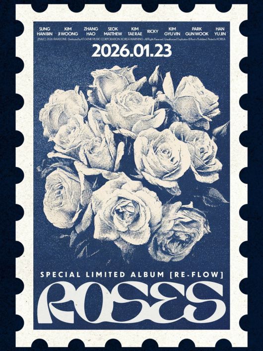 제로베이스원(성한빈, 김지웅, 장하오, 석매튜, 김태래, 리키, 김규빈, 박건욱, 한유진)은 오늘(20일) 공식 SNS에 스페셜 리미티드 앨범 '리플로우(RE-FLOW)'의 수록곡 '로지즈(ROSES)'의 트랙 포스터를 게재했다.