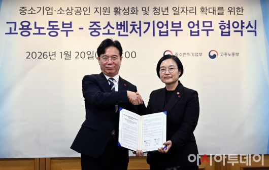 아시아투데이 박성일 기자 = 고용노동부와 중소벤처기업부는 20일 오후 서울 종로구 정부서울청사에서 중소기업·소상공인과 청년 일자리를 위한 업무협약(MOU)을 체결했다.김영훈 노동부 장관과 한성숙 중소벤처기업부 장관이 업무협약 후 기념촬영을 하고 있다. ⓒ "젊은 파워, 모바일 넘버원 아시아투데이"