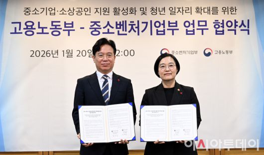 아시아투데이 박성일 기자 = 고용노동부와 중소벤처기업부는 20일 오후 서울 종로구 정부서울청사에서 중소기업·소상공인과 청년 일자리를 위한 업무협약(MOU)을 체결했다.