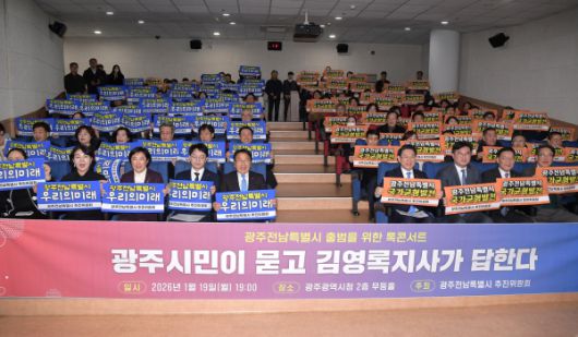 강기정 광주광역시장, 광주전남특별시 출범을 위한 톡 콘서트'에 참석 [사진=광주광역시]강기정 광주광역시장이 19일 시청 무등홀에서 열린 '(가칭)광주전남특별시 출범을 위한 톡 콘서트'에 참석해 참석자들과 함께 퍼포먼스를 하고 있다.
