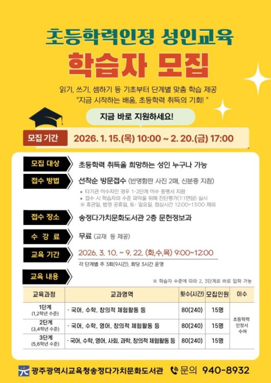 광주시교육청송정다가치문화도서관(이하 송정다가치문화도서관)은 '2026학년도 초등학력인정 성인교육' 프로그램을 운영한다_ 포스터 [사진=광주광역시교육청][광주 전남=팍스경제TV] 광주시교육청송정다가치문화도서관(이하 송정다가치문화도서관)은 '2026학년도 초등학력인정 성인교육' 프로그램을 운영합니다.