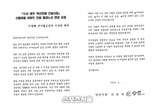 〔스포츠서울│수원=좌승훈기자〕경기 성남시는 지난 16일 김윤덕 국토교통부 장관과 이성해 국가철도공단 이사장에게 ‘수서~광주 복선전철건설사업’과 관련해 여수동 산들마을 아파트 인접 통과 구간의 노선 변경을 요청하는 서한을 전달했다고 20일 밝혔다.