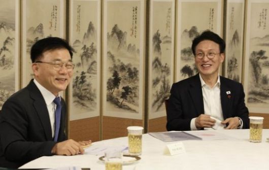 [포토] 경제현안 간담회 하는 김민석 총리와 박상진 산은 회장
