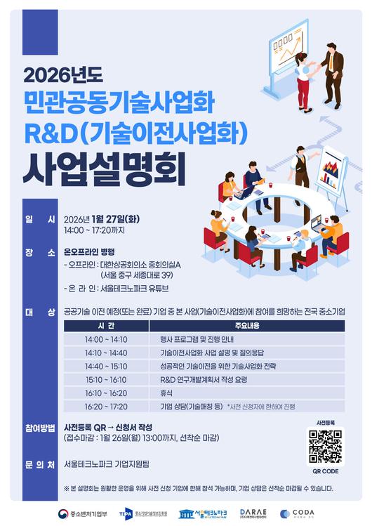 서울테크노파크(원장 윤종욱)는 1월 27일 대한상공회의소 중회의실A에서 2026년 민관공동기술사업화(R&D) 기술이전사업화 사업설명회를 개최한다고 20일 밝혔다. 이번 설명회는 공공기술 이전을 계획 중인 본 사업에 참여를 희망하는 전국 중소기업을 대상으로 마련되며, 서울테크노파크 공식 유튜브 채널을 통해 실시간 중계도 진행된다.
