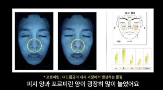 실제로 피부 진단 기기로 측정한 결과 실험 전 31세 수준이던 피부 나이는 36세로 측정돼 5살이 증가했다. 피부 타입은 복합성에서 지성으로 바뀌었고 자외선 촬영에서도 코 주변을 중심으로 피지량 증가와 모공 상태 악화가 뚜렷하게 확인됐다.