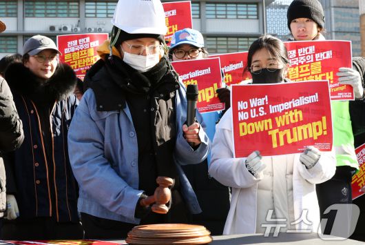 (서울=뉴스1) 최지환 기자 = 20일 서울 종로구 주한미국대사관 앞에서 열린 '트럼프 1년 규탄 국제민중행동 국제민중재판'에서 참가자들이 트럼프 대통령에게 유죄를 선고하는 퍼포먼스를 하고 있다. 2026.1.20/뉴스1