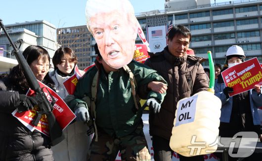 (서울=뉴스1) 최지환 기자 = 20일 서울 종로구 주한미국대사관 앞에서 열린 '트럼프 1년 규탄 국제민중행동 국제민중재판'에서 참가자들이 트럼프 대통령에게 유죄를 선고하는 퍼포먼스를 하고 있다. 2026.1.20/뉴스1