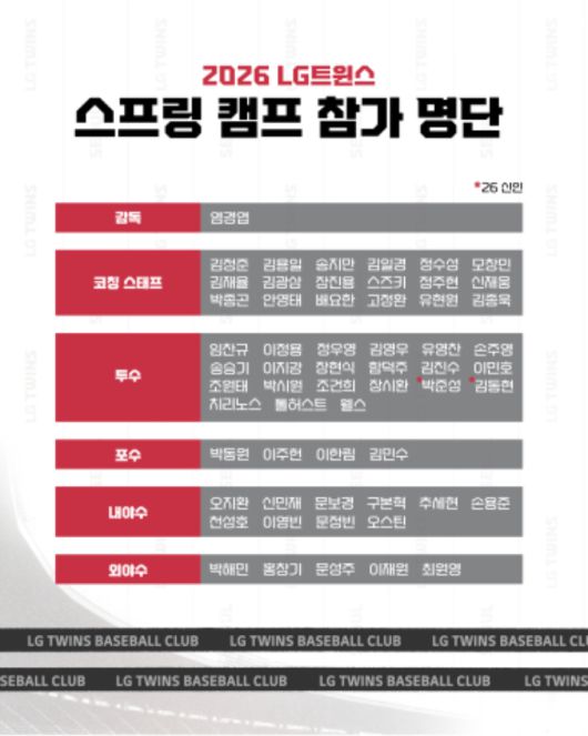 LG는 20일 "2026년 전지 훈련을 위해 오는 22일과 23일 미국 애리조나로 출국한다"고 밝혔다. 25일부터 2월 22일까지 진행되는 애리조나 전지 훈련에는 염경엽 감독과 코칭스태프 18명, 주장 박해민을 비롯한 선수 40명이 참가한다.