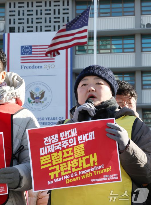 (서울=뉴스1) 최지환 기자 = 20일 서울 종로구 주한미국대사관 앞에서 트럼프 1년 규탄 국제민중공동행동 조직위원회를 비롯한 시민단체 회원들이 '트럼프 1년 규탄 국제민중행동 국제민중재판'을 열고 있다. 2026.1.20/뉴스1