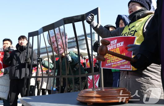 (서울=뉴스1) 최지환 기자 = 20일 서울 종로구 주한미국대사관 앞에서 열린 '트럼프 1년 규탄 국제민중행동 국제민중재판'에서 참가자들이 트럼프 대통령에게 유죄를 선고하는 퍼포먼스를 하고 있다. 2026.1.20/뉴스1