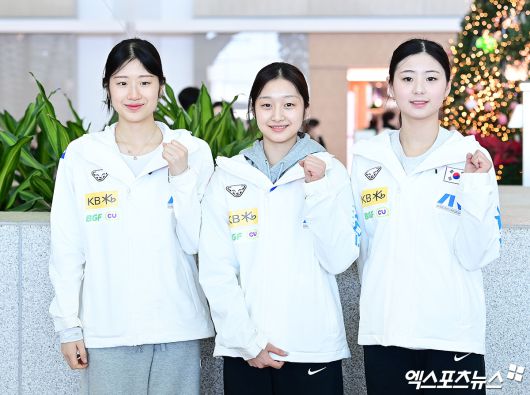 (엑스포츠뉴스 인천공항, 박지영 기자) 국제빙상경기연맹(ISU) 4대륙선수권대회에 출전하는 대한민국 피겨 국가대표팀 선수들이 20일 오후 인천국제공항을 통해 중국 베이징으로 출국했다. 여자 싱글 이해인, 신지아, 윤아선이 기념 촬영을 하고 있다.박지영 기자 jypark@xportsnews.com