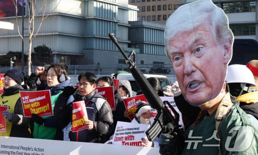 (서울=뉴스1) 최지환 기자 = 20일 서울 종로구 주한미국대사관 앞에서 트럼프 1년 규탄 국제민중공동행동 조직위원회를 비롯한 시민단체 회원들이 '트럼프 1년 규탄 국제민중행동 국제민중재판'에서 구호를 외치고 있다. 2026.1.20/뉴스1choipix@news1.krCopyright ⓒ 뉴스1. All rights reserved. 무단 전재 및 재배포, AI학습 이용 금지.