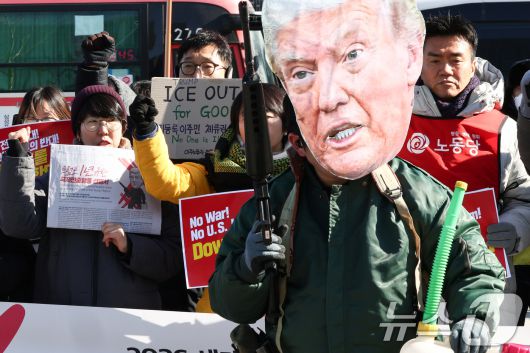 (서울=뉴스1) 최지환 기자 = 20일 서울 종로구 주한미국대사관 앞에서 트럼프 1년 규탄 국제민중공동행동 조직위원회를 비롯한 시민단체 회원들이 '트럼프 1년 규탄 국제민중행동 국제민중재판'에서 구호를 외치고 있다. 2026.1.20/뉴스1