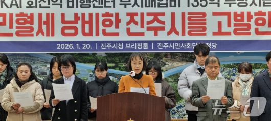진주시민사회단체들이 20일 진주시청에서 기자회견을 열고 KAI 회전익 비행센터 부지매입비에 대해 설명하고 있다. 2026.1.20/뉴스1 한송학기자 |