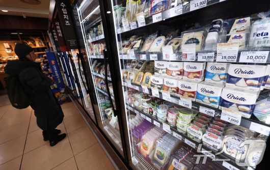 (서울=뉴스1) 구윤성 기자 = 20일 서울의 한 대형마트에서 한 시민이 수입 치즈를 살펴보고 있다. 한국은행이 이날 발표한 수입물가지수에 따르면, 지난해 12월 기준 원화 기준 수입 식품 물가는 축산물과 곡물을 중심으로 가파른 상승세를 보였다. 치즈의 경우 계약통화 기준으로는 0.2% 하락했으나, 환율이 3.3%p나 영향을 미치면서 원화 기준으로는 오히려 3.1% 상승했다. 2026.1.20/뉴스1